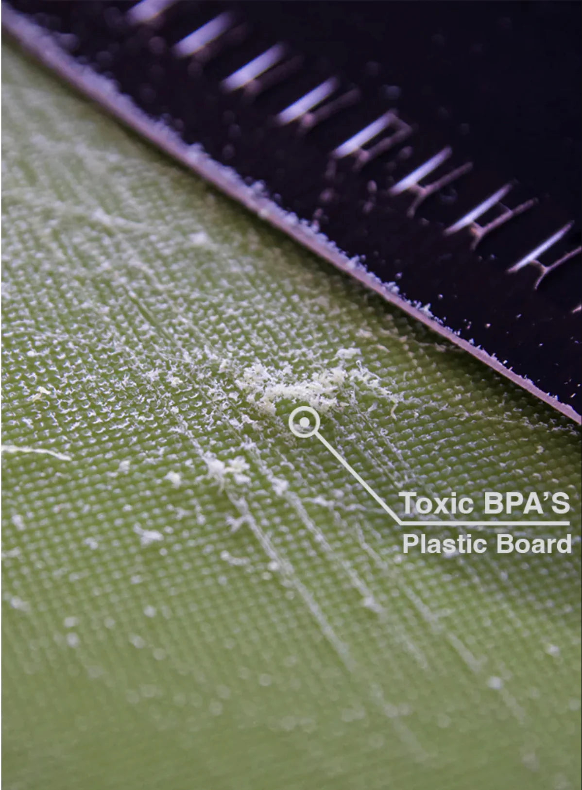 Everyday, your cutting board comes into contact with most things you eat. Imagine the dangers lurking on an old wooden board soaked withinvisible mold that slowly makes you ill, ortiny microscopic plastic shavings mixing into your foodfrom a worn-out board that eventually end up in your bloodstream & disrupts your hormones.