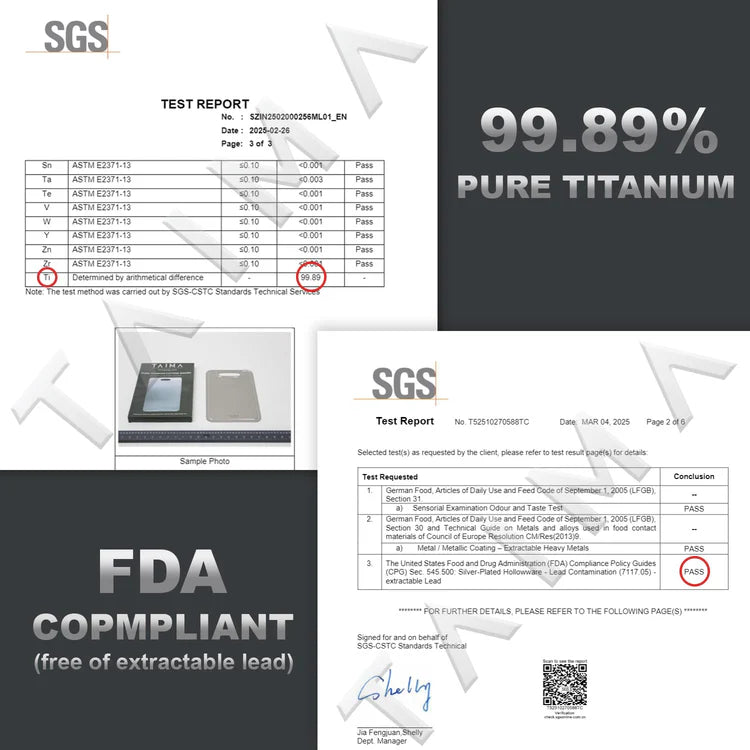 We’re proud to be theonlybrand withSGS certificationconfirming our cutting board is99.89% pure titanium -the highest standard in safety and purity.