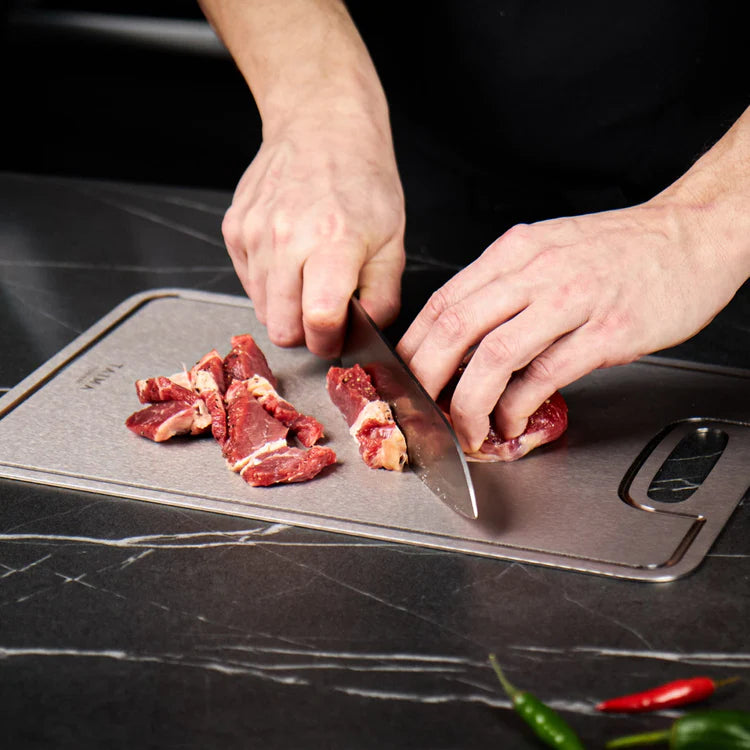 Titanium is 3x softer on a hardness scale than the stainless steel used in most knives, so it won’t dull blades quickly, if ever, helping your knives last longer & perform better, saving you money on the long run. The Taima titanium cutting board surpasses other materials by not absorbing odors, avoiding bacterial buildup, and being free from harmful chemicals.
